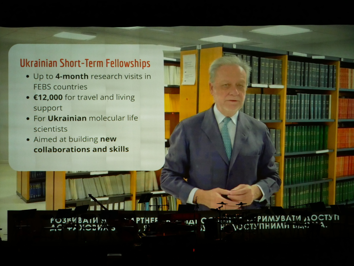 Once again, I warmly congratulate the entire staff of the Institute, all employees, and everyone present in the hall on this remarkable event in the scientific life of Ukraine. I sincerely wish everyone well-being and health, family comfort, great success, and, of course, a just and swift victory of Ukraine over the bloody aggressor. Long live the Institute of Biochemistry. Glory to Ukraine!"