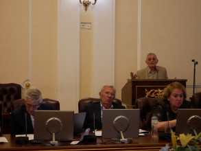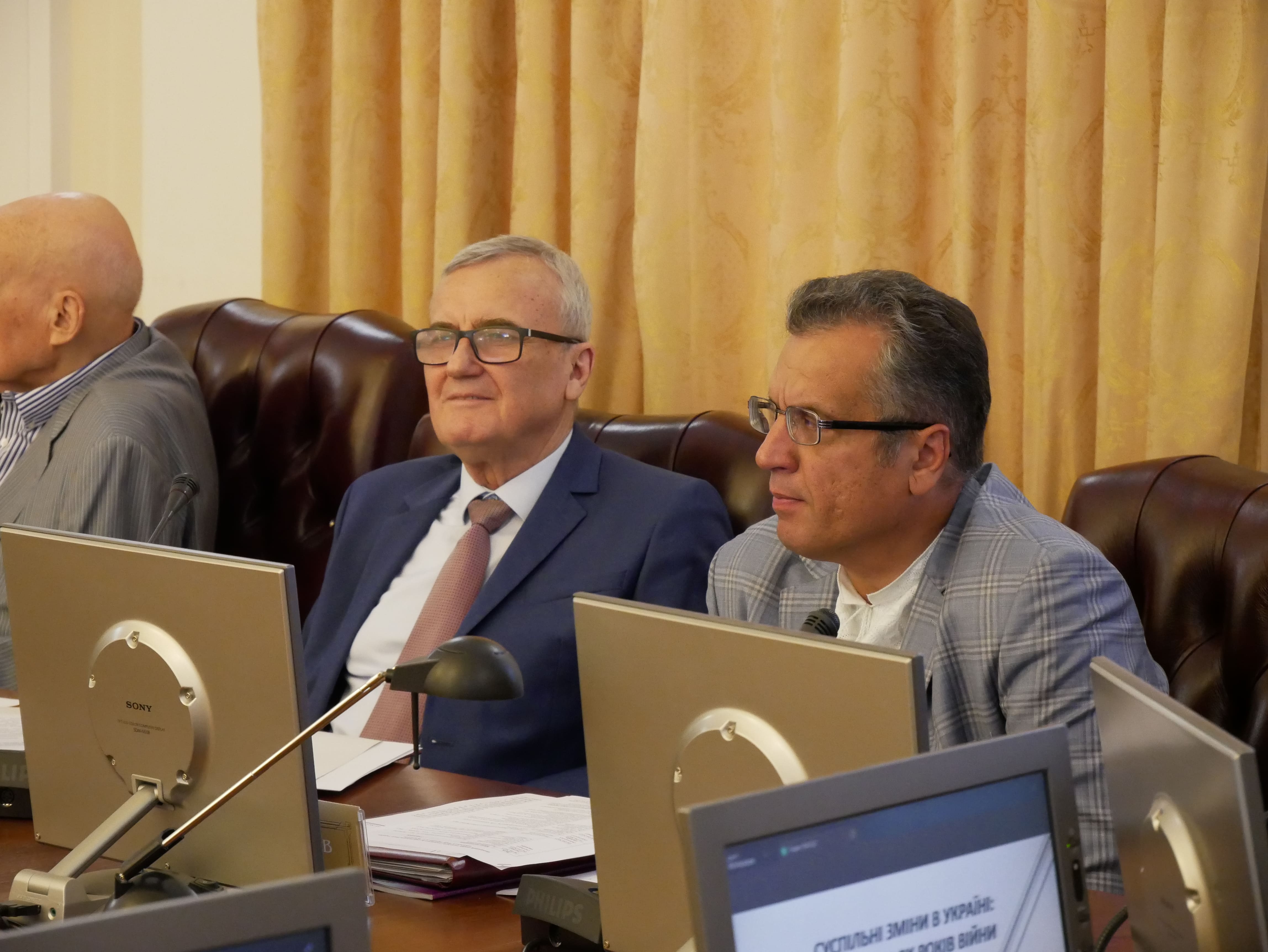 Далі було заслухано доповідь директора Інституту соціології НАН України члена-кореспондента НАН України Євгена Головахи на тему «Суспільні зміни в Україні: досвід трьох років війни і перспективи».
