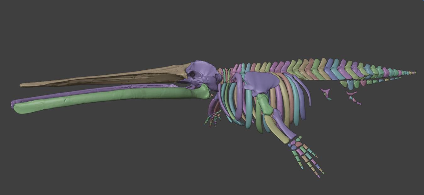 – По-перше, вона корисна для подальших біомеханічних досліджень. Тобто завдяки реконструкції окремих кісток буде значно зручніше реконструювати м’язову систему цього кита і так далі, щоб зрозуміти, як він рухався і якими були ступені свободи його хребта. З однієї суцільної структури цього не зрозуміти, а от уже окремі елементи можна обертати у певних анатомічних позиціях і дивитись, наскільки взагалі міг згинатися хребет у тій чи тій площині. Так само і з черепом. Бо про кінетизм черепа вусатих китів уже ніби доволі багато сказано, та подальші дослідження все ще потрібні. Тому що кити – серед небагатьох ссавців, у яких верхня щелепа теж почасти рухлива (така ж конвергенція трапляється у деяких птахів). Для віртуального моделювання цієї рухливості наш скан теж буде корисний. Ми ж опублікували його в дуже різноплановому журналі “Scientific Data”, присвяченому науковим дата-сетам: там публікуються і геноми, й інші набори даних, і фотографії, і моделі. Тепер є і наш результат. І він доступний абсолютно для всіх.