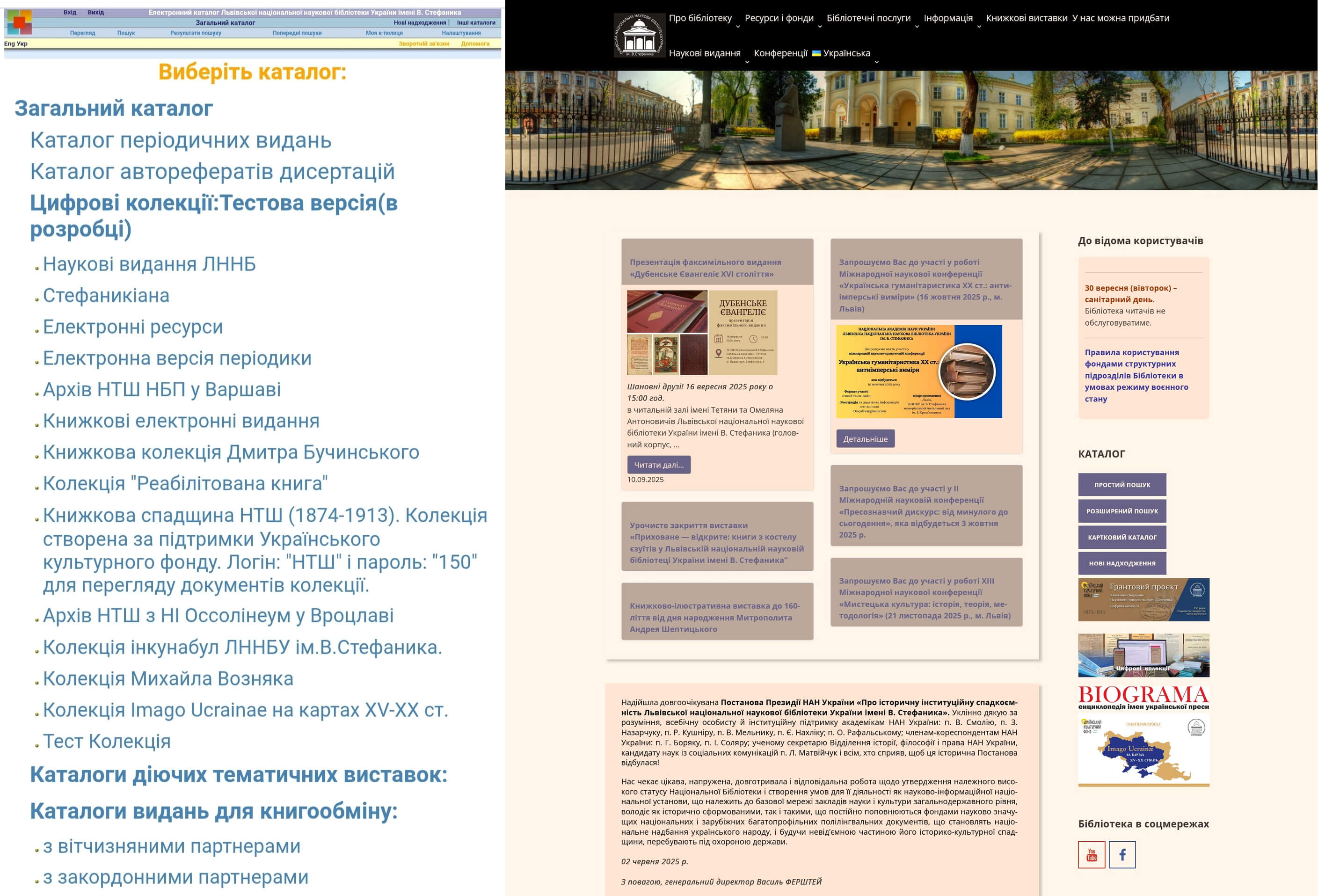 Ліворуч – сторінка електронного каталогу Львівської національної наукової бібліотеки України імені В. Стефаника, праворуч – головна сторінка офіційного вебсайту Бібліотеки