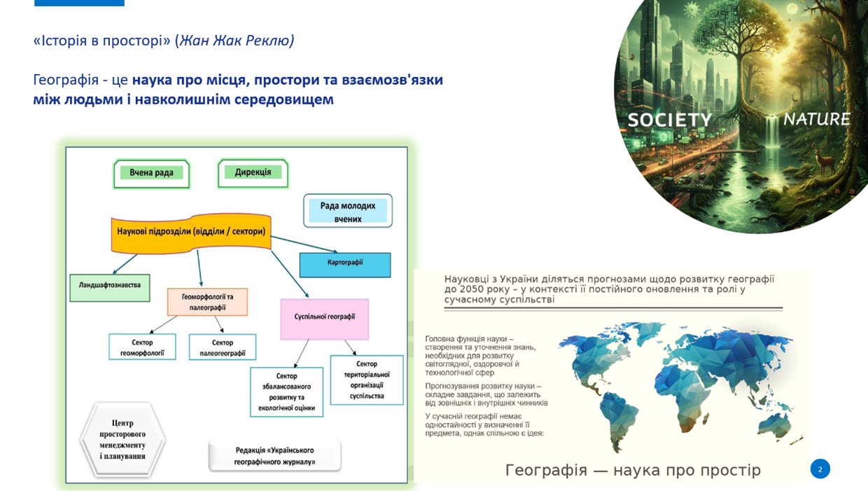 Директорка Інституту географії НАН України член-кореспондент НАН України Євгенія Маруняк поінформувала керівництво Академії про основні напрями діяльності цієї установи щодо забезпечення збалансованого розвитку України та її регіонів, атласного і ГІС-картографування, природничих і суспільно-географічних досліджень, окремо відзначивши коригування тематики досліджень Інституту з огляду на виклики перед наукою та суспільством, пов’язані з російсько-українською війною, а також висвітлила основні здобутки установи, її експертну й міжнародну діяльність, окреслила подальші перспективи її розвитку.