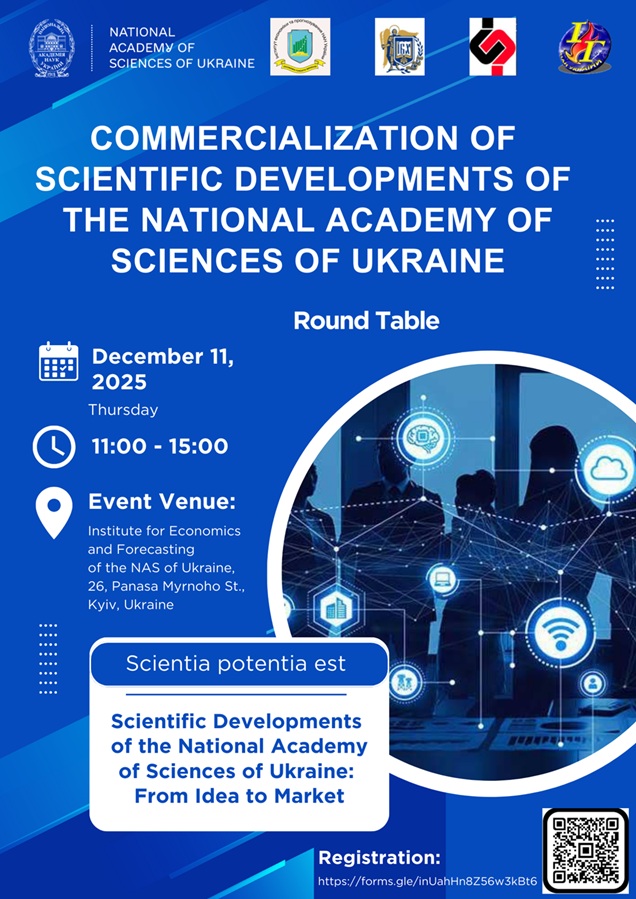 11 грудня 2025 року в Інституті економіки та прогнозування НАН України відбудеться круглий стіл «Комерціалізація наукових розробок НАН України».