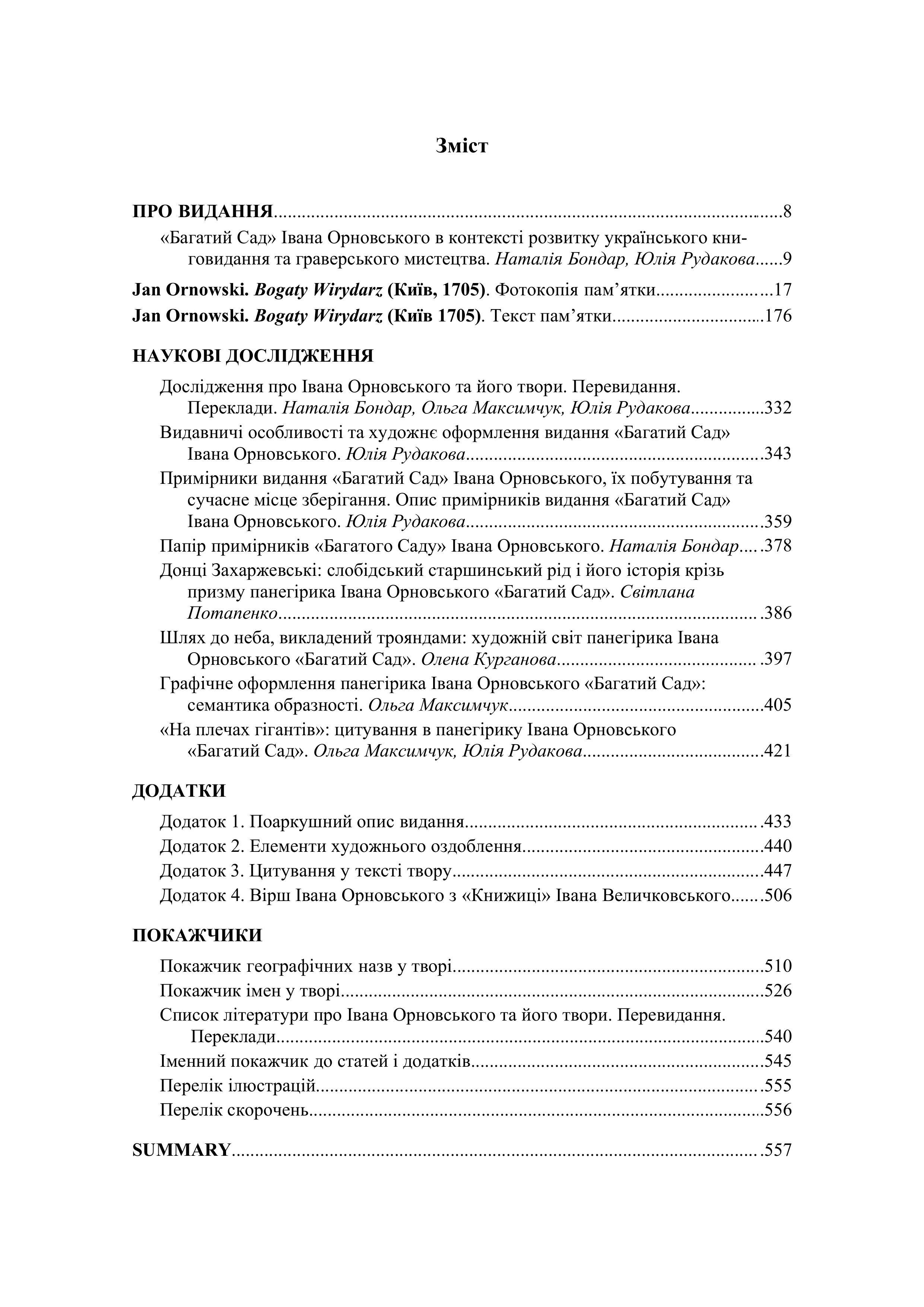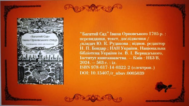«Багатий Сад» Івана Орновського 1705 р. : перевидання, текст, дослідження / уклад. Ю. К. Рудакова ; відп. ред. Н. П. Бондар ; НАН України, Нац. б-ка України ім. В. І. Вернадського, Ін-т книгозн. Київ: НБУВ, 2024. URL: http://irbis-nbuv.gov.ua/everlib/item/er-0005039