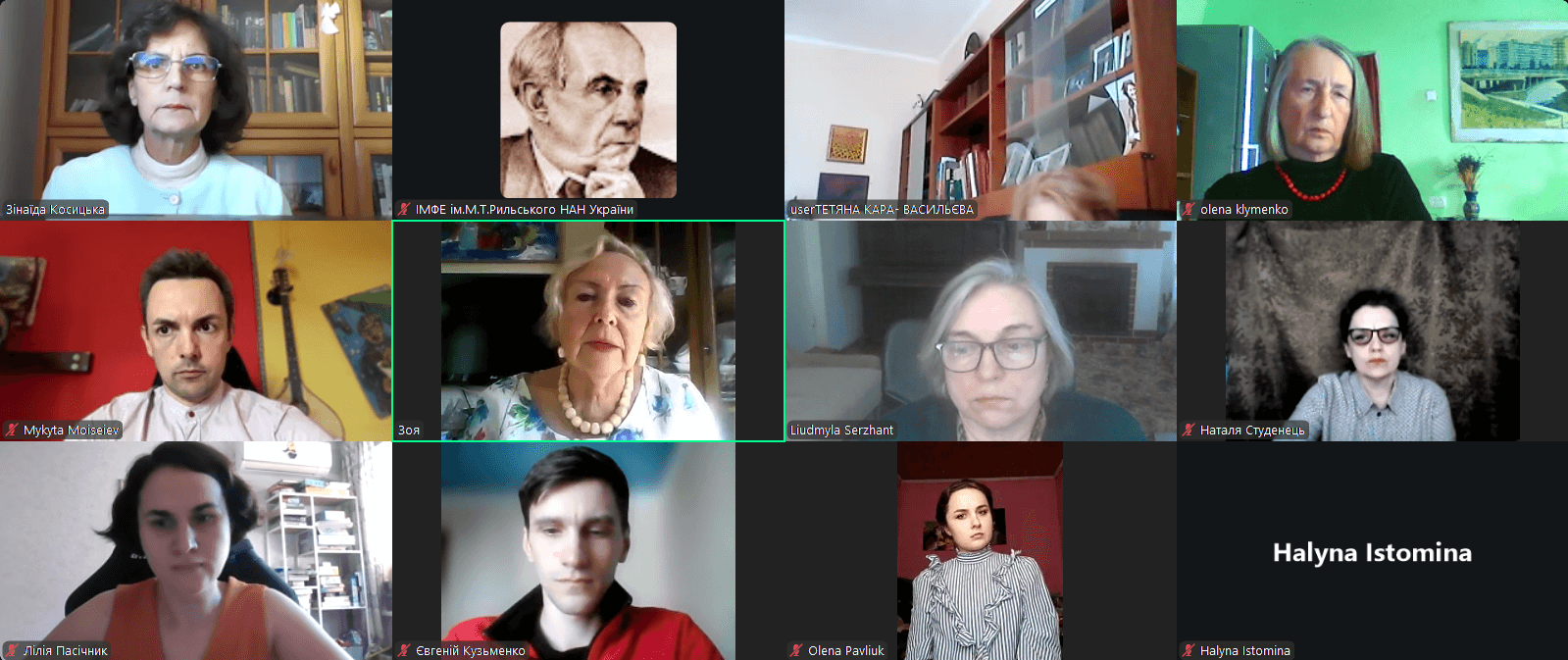 З огляду на багатопрофільність Інституту мистецтвознавства, фольклористики та етнології ім. М. Т. Рильського НАН України, актуальними були роздуми щодо специфіки функціонування відділу екранно-сценічних мистецтв та культурології цієї установи, якими поділилась у доповіді «Державницьке мислення академіка Ганни Скрипник у сприянні роботі підрозділу екранно-сценічних мистецтв та культурології в перші роки російсько-української війни» його очільниця – доктор філологічних наук, професор Наталія Мех.
