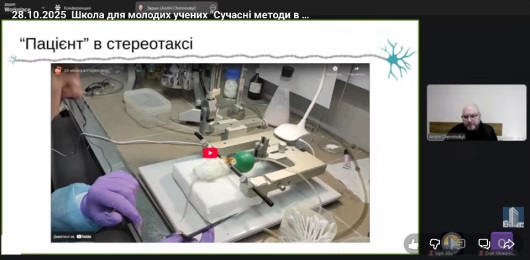 Завершив лекційну частину старший науковий співробітник відділу фізико-хімічної біології клітинних мембран кандидат біологічних наук, старший дослідник Андрій Чернінський, який продемонстрував сучасні підходи до аналізу активності головного мозку тварин за умов вільної поведінки.
