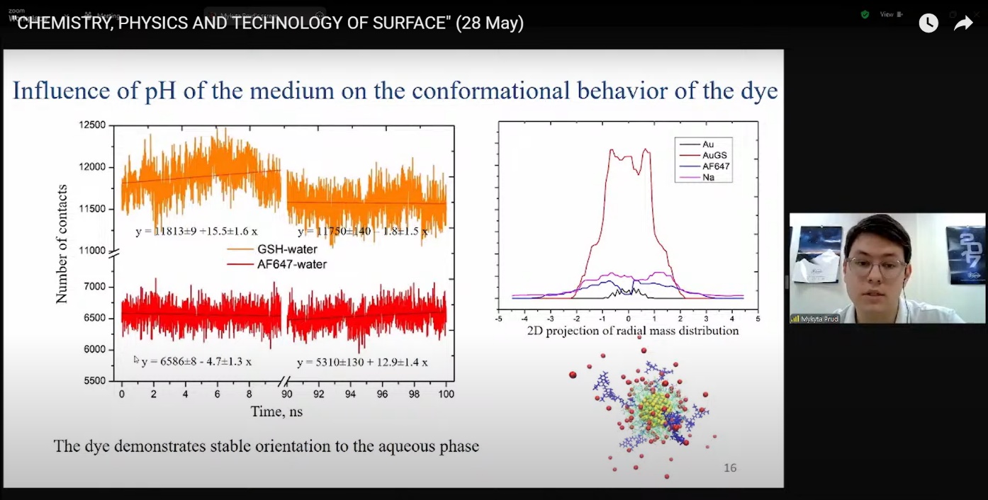 Студент Харківського національного університету імені В.Н. Каразіна Микита Прудь зосередився на молекулярно-динамічному моделюванні модифікованої барвником AlexaFluor 647 і/чи біологічно активним трипептидом глутатіоном ультрамалих наночастинок золота, які є перспективним матеріалом для біовізуалізації та тераностики. Розроблено нові оптимізовані моделі наночастинок золота, оцінено лігандну упаковку поверхнево зв’язаного глутатіону, поверхневу ємність наночастинки щодо лігандів глутатіону та динаміку сольватації кон’югату «барвник–наночастинка» у водному розчині за нейтрального та лужного pH.