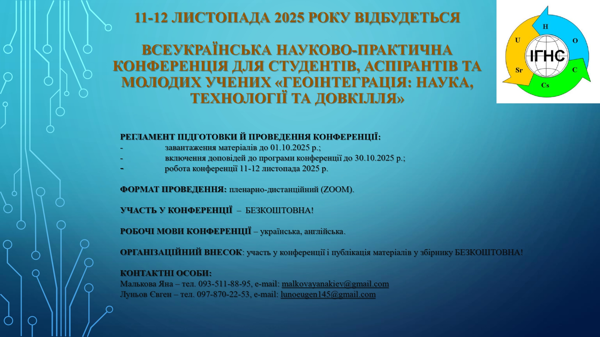 1-12 листопада 2025 року відбудеться Всеукраїнська науково-практична конференція для студентів, аспірантів та молодих учених «Геоінтеграція: наука, технології та довкілля».