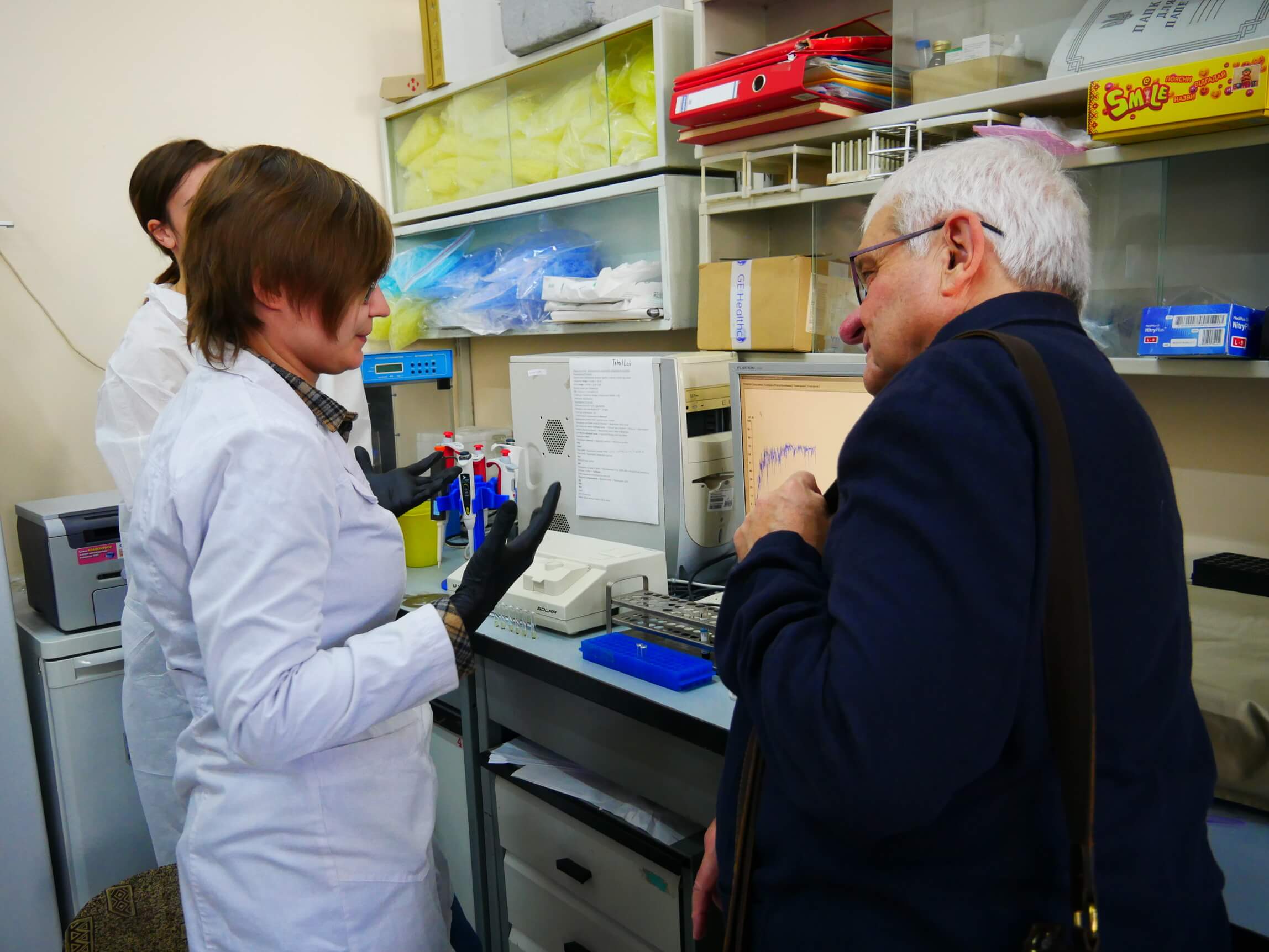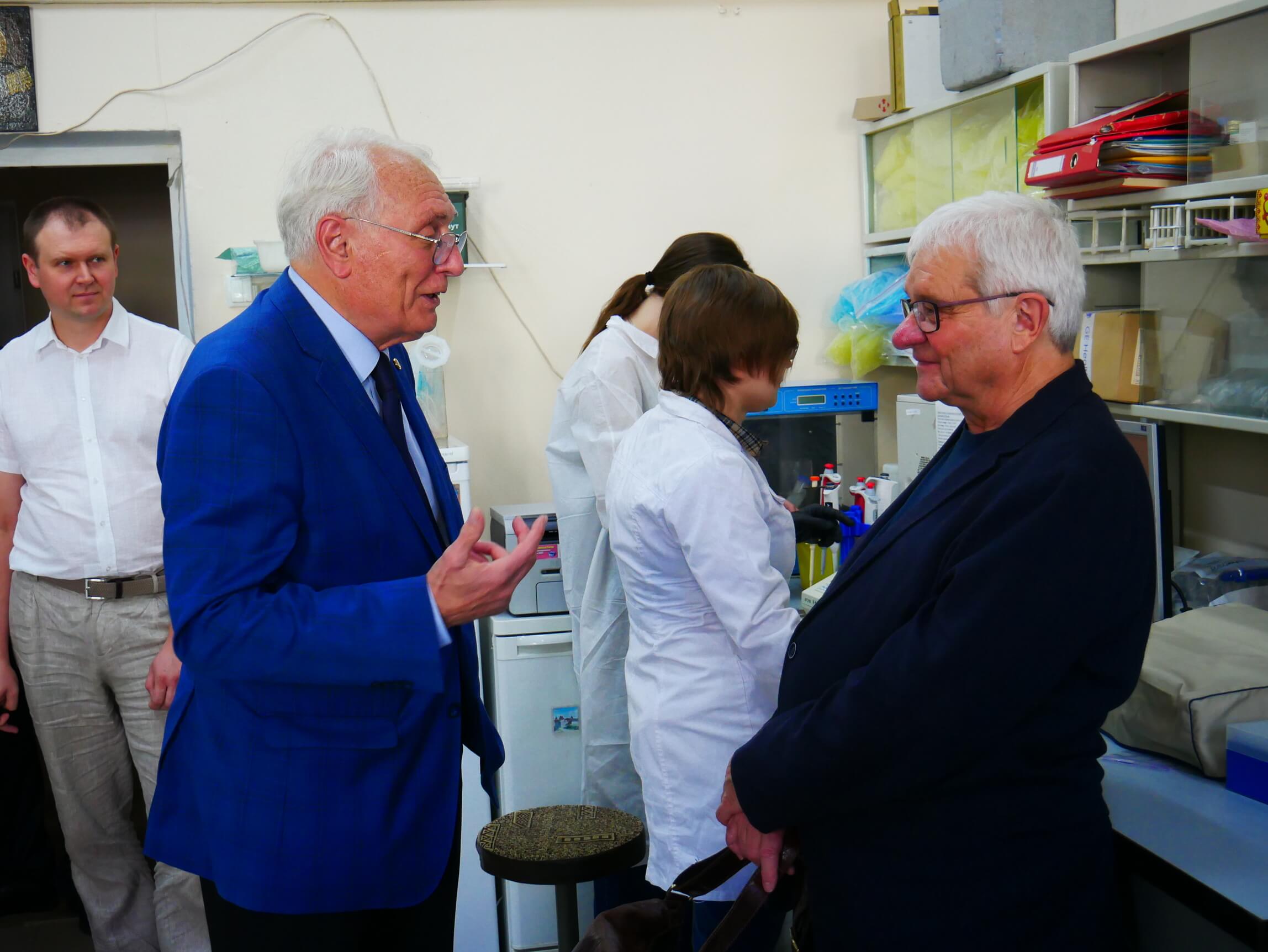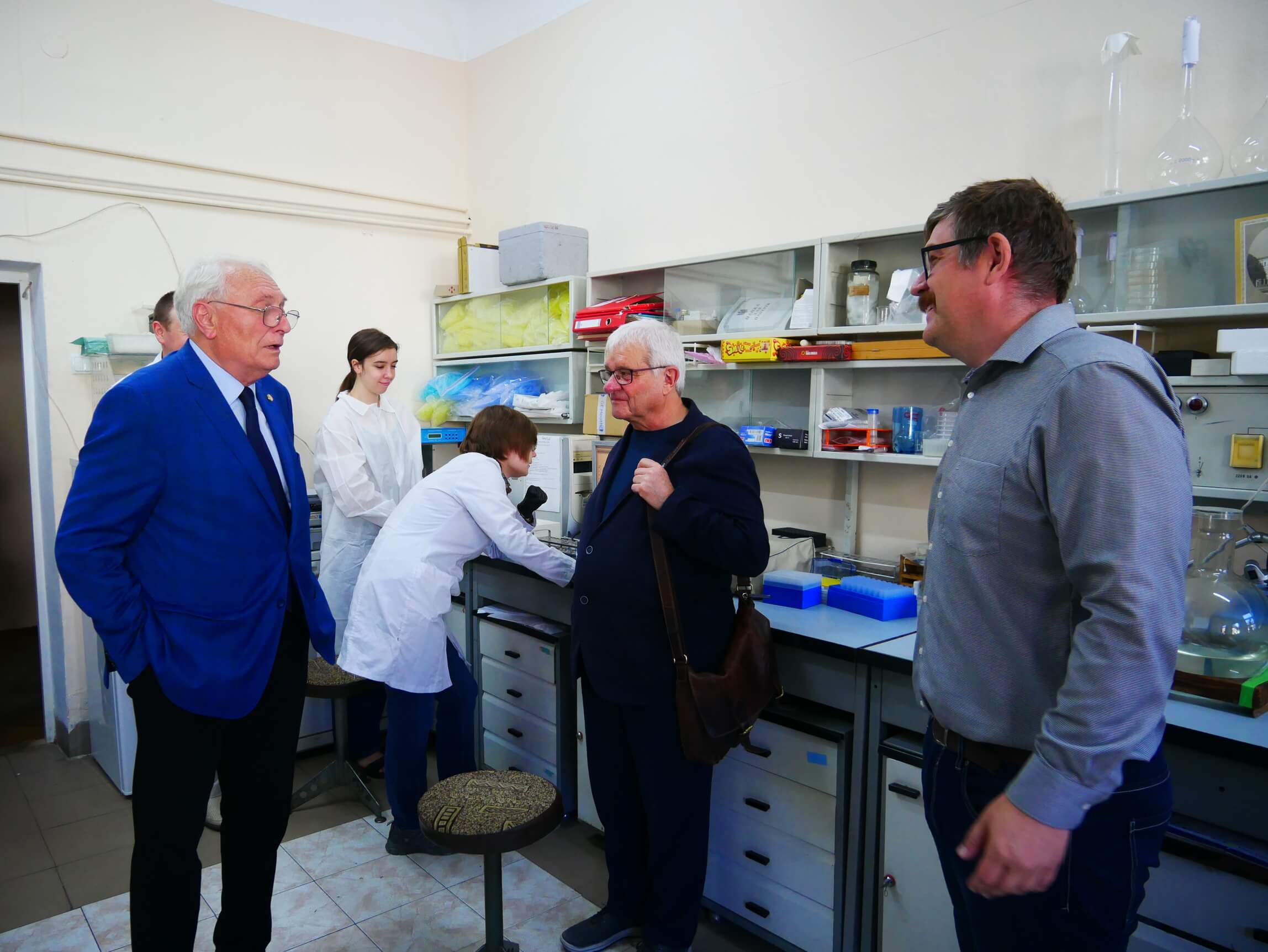 Далі гостеві запропонували відвідати лабораторію відділу структури і функції білка Інституту біохімії ім. О.В. Палладіна НАН України. Заступник директора з наукової роботи Інституту доктор біологічних наук Володимир Чернишенко розповів гостеві про виконувані у цій лабораторії дослідження, зокрема про розроблення ефективних кровоспинних засобів, що є особливо актуальною для нашої країни медико-біологічною проблемою.