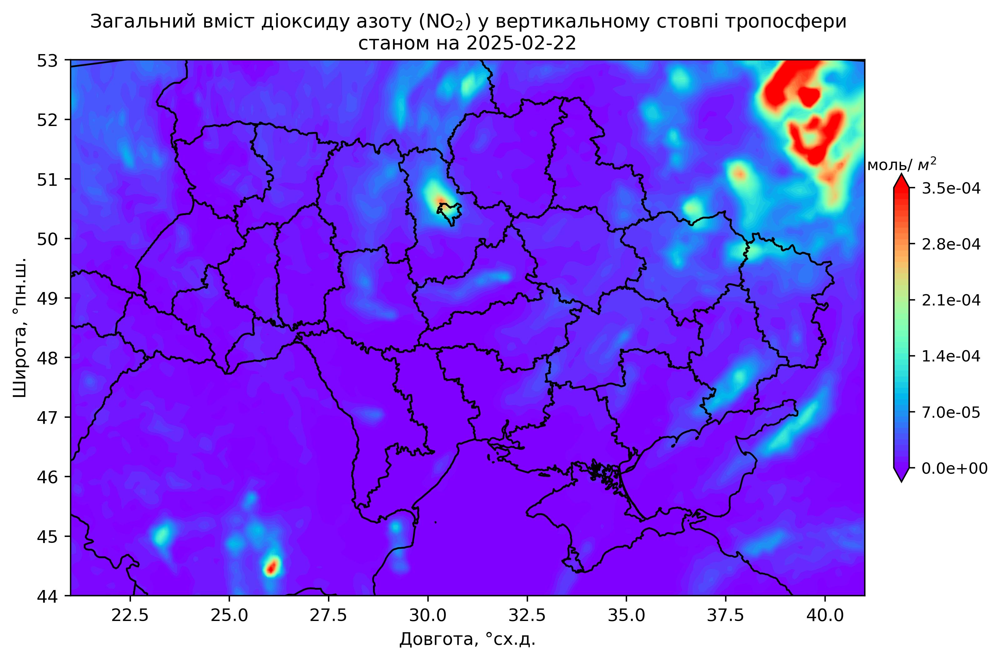 NO2 є зручною індикативною забруднюючою речовиною для порівняння загального стану якості атмосферного повітря над різними територіями, особливо згідно з даними супутникового зондування. Як видно з рис.3, на території України забруднення формувалося переважно локально і було пов’язане із власними антропогенними викидами міст (крім одного випадку перенесення забруднення 23 лютого до Харківської області від джерел викидів на території росії). У Києві найвищі концентрації формувалися саме внаслідок власних викидів. На рис.4 зображено вміст NO2: видно, як забруднений шлейф поширюється від Києва за переважальним напрямом вітру.