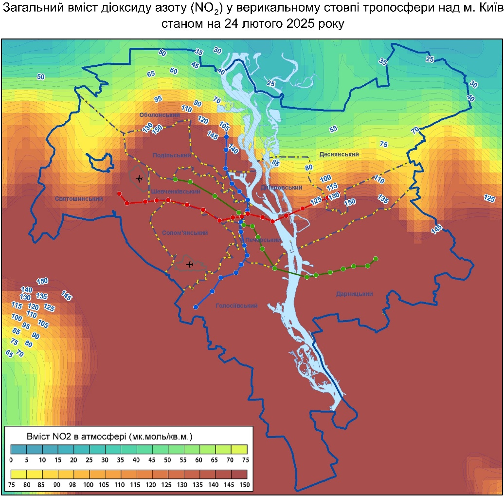 Щодо впливу воєнних дій на погіршення якості атмосферного повітря (а цей чинник часто і недооцінюють, і переоцінюють), то в Українському гідрометеорологічному інституту ДСНС України та НАН України дійшли ось якого висновку. У лютому 2025 року вплив воєнних дій не був визначальним у формуванні концентрацій забруднюючих речовин у містах на території України. Наслідки воєнних дій були епізодичними й точковими, вони формувалися через пожежі після ракетних ударів і атак безпілотними літальними апаратами, але не визначали характеру загального розподілу забруднення на території України. На рис.3 зображено просторовий розподіл загального вмісту діоксиду азоту (NO2) з повним просторовим охопленням території України й суміжних районів станом на 22, 23 та 24 лютого 2025 року за даними супутникового приладу TROPOMI, супутника Sentinel-5 Precursor.
