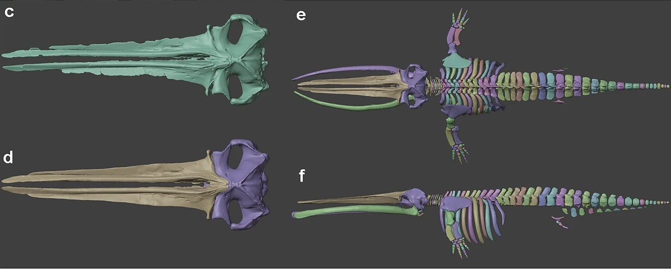 Скан черепа до (с) та після (d) віртуальної реставрації; віртуальна 3D-реконструкція повного скелета цетотерія Рябініна (e, f). Ілюстрація: https://www.nature.com/articles/s41597-025-06086-2