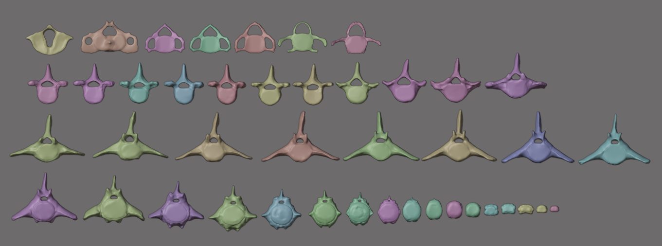 Окремі моделі хребців шийного, грудного, поперекового та хвостового відділів хребта цетотерія з реконструйованими суглобовими поверхнями (вигляд cпереду)
