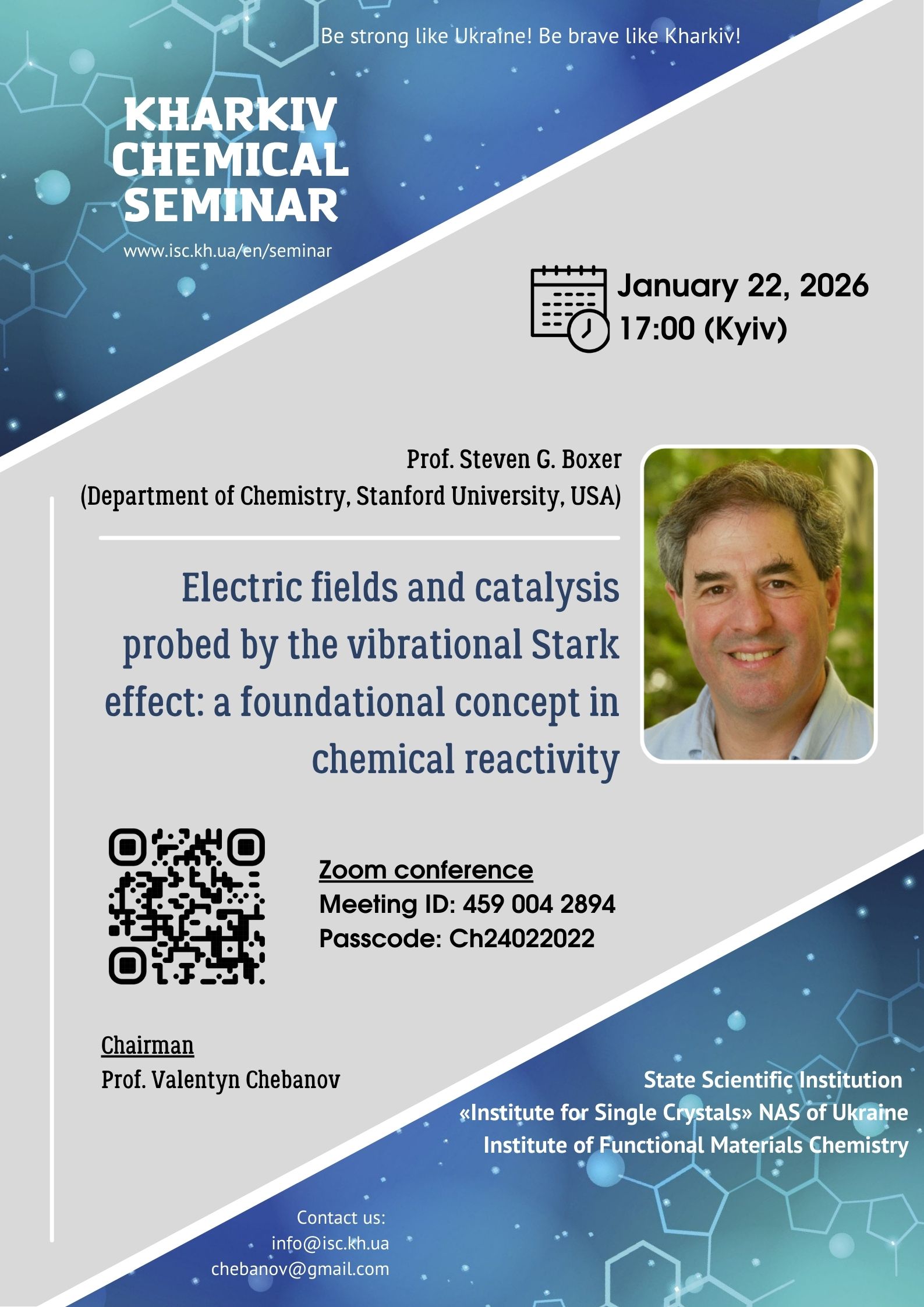 Тема доповіді: «Електричні поля та каталіз, досліджені за допомогою вібраційного ефекту Штарка: фундаментальна концепція хімічної реакційної здатності» (Electric fields and catalysis probed by the vibrational Stark effect: a foundational concept in chemical reactivity).