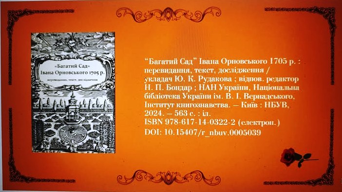 28 жовтня 2025 року у відділі стародруків та рідкісних видань Інституту книгознавства Національної бібліотеки України імені В. І. Вернадського відбулася презентація електронного видання «“Багатий Сад” Івана Орновського 1705 р. : перевидання, текст, дослідження». Захід, що тривав у змішаному форматі очного й онлайн-спілкування, зібрав авторів публікації, рецензентів, фахівців з інших підрозділів Бібліотеки й зацікавлених колег-науковців.