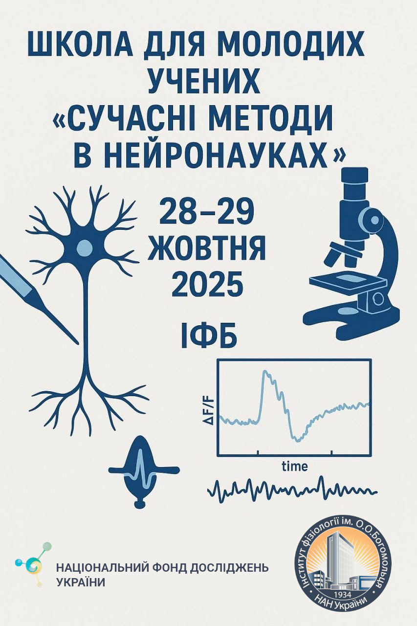 28–29 жовтня 2025 року в Інституті фізіології ім. О. О. Богомольця НАН України успішно відбулася віртуальна школа «Сучасні методи в нейронауках», організована за підтримки гранта Національного фонду досліджень України (НФДУ №2023.05/002). Захід присвячувався сучасним експериментальним і аналітичним підходам у нейронауках та об’єднав молодих учених, аспірантів і студентів із різних міст України.