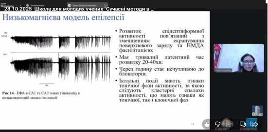 Аспірантка відділу фізико-хімічної біології клітинних мембран Марія Клименко представила підхід до дослідження епілептиформної активності на зрізах мозку.