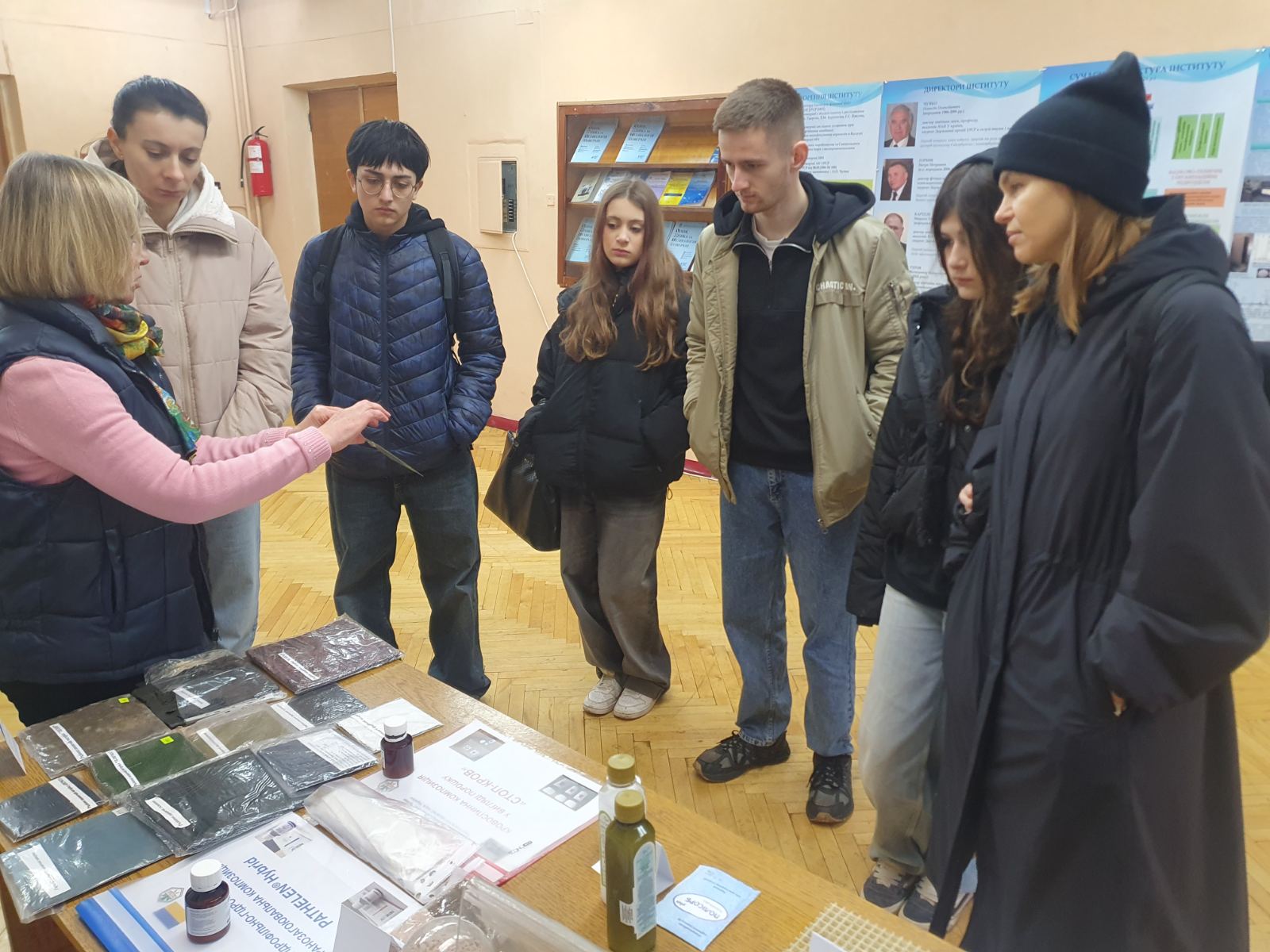 Далі старший науковий співробітник науково-координаційного відділу кандидат хімічних наук Ірина Лагута ознайомила молодих відвідувачів із науковими розробками Інституту, представленими у вигляді натурних зразків (зокрема, кровоспинними і ранозагоювальними засобами та медичними й екологічними сорбентами) і на інформаційних плакатах.