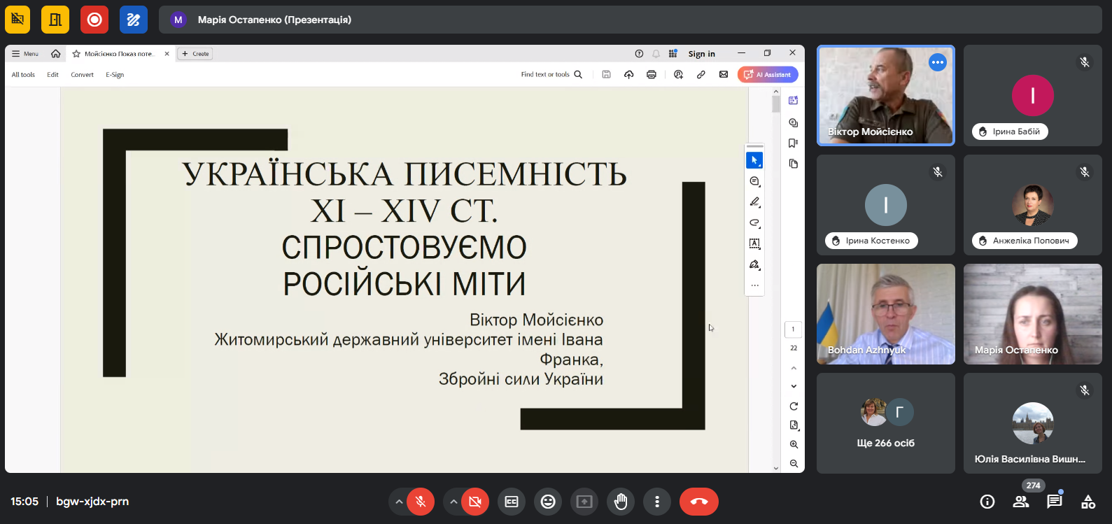 У лекції «Українська писемність ХІ–ХІV ст. Спростовуємо російські міти» професор Житомирського державного університету імені Івана Франка член-кореспондент НАН України Віктор Мойсієнко на матеріалах літературних пам’яток ХІ–ХІV ст. продемонстрував причини виникнення російських міфів про походження української та російської мов та послідовно їх деконструював.