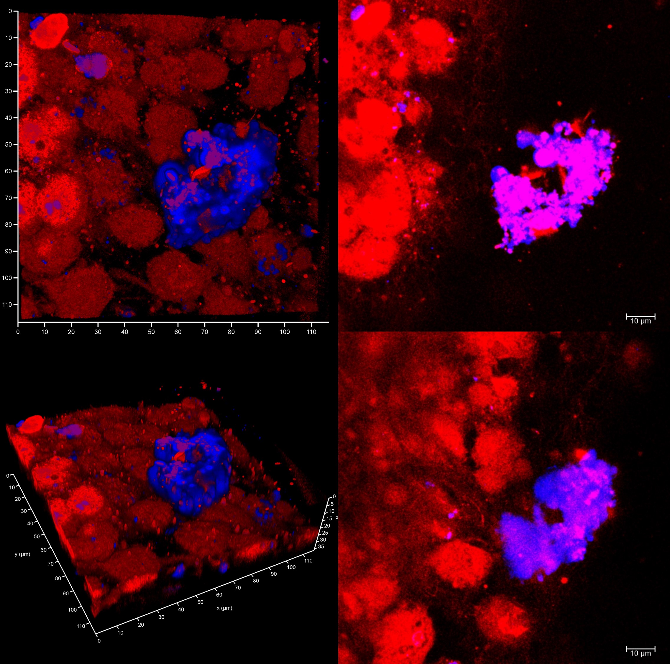 Гістологічна картина інфекційного ендокардиту: гранульома в реконструйованому з перикарду клапані аорти, яка сформувалася навколо інфекційного осередку (синім кольором зображено біоплівку, вкриту езкополісахаридами, що захищають її від фагоцитозу), помітні окремі нитки еДНК – нетозні екзоклітинні пастки, які обмежують поширення інфекції на інші ділянки епітелію, зокрема, зв’язуючи планктонні форми бактерій, що відшаровуються від біоплівки (червоним кольором). Забарвлення – бромистий етидій (ДНК-специфічний) і калькофлуор вайт (полісахарид-специфічний). Ліворуч – об’ємне зображення, праворуч – пошарові оптичні зрізи.