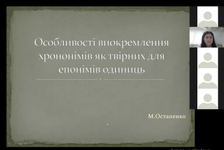 Завершила конференцію молодший науковий співробітник відділу загального мовознавства Інституту мовознавства ім. О. О. Потебні НАН України доктор філософії Марія Остапенко – з науковою доповіддю «Особливості виокремлення хрононімів як твірних для епонімів одиниць», де окреслила обсяг поняття хрононімів, підходи дослідників до їх класифікації та опису в українській, англійській і французькій мовах, представила їхню роль у творенні епонімів.