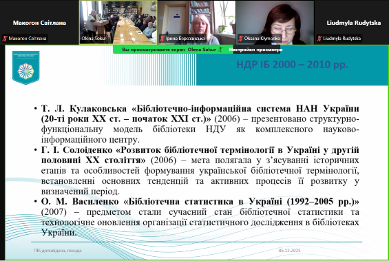 - директорка Інституту бібліотекознавства Національної бібліотеки України імені В. І. Вернадського кандидатка історичних наук Ольга Василенко («Наукові проєкти Інституту бібліотекознавства Національної бібліотеки України імені В. І. Вернадського в контексті актуальних проблем бібліотечної справи (2011–2026)»);