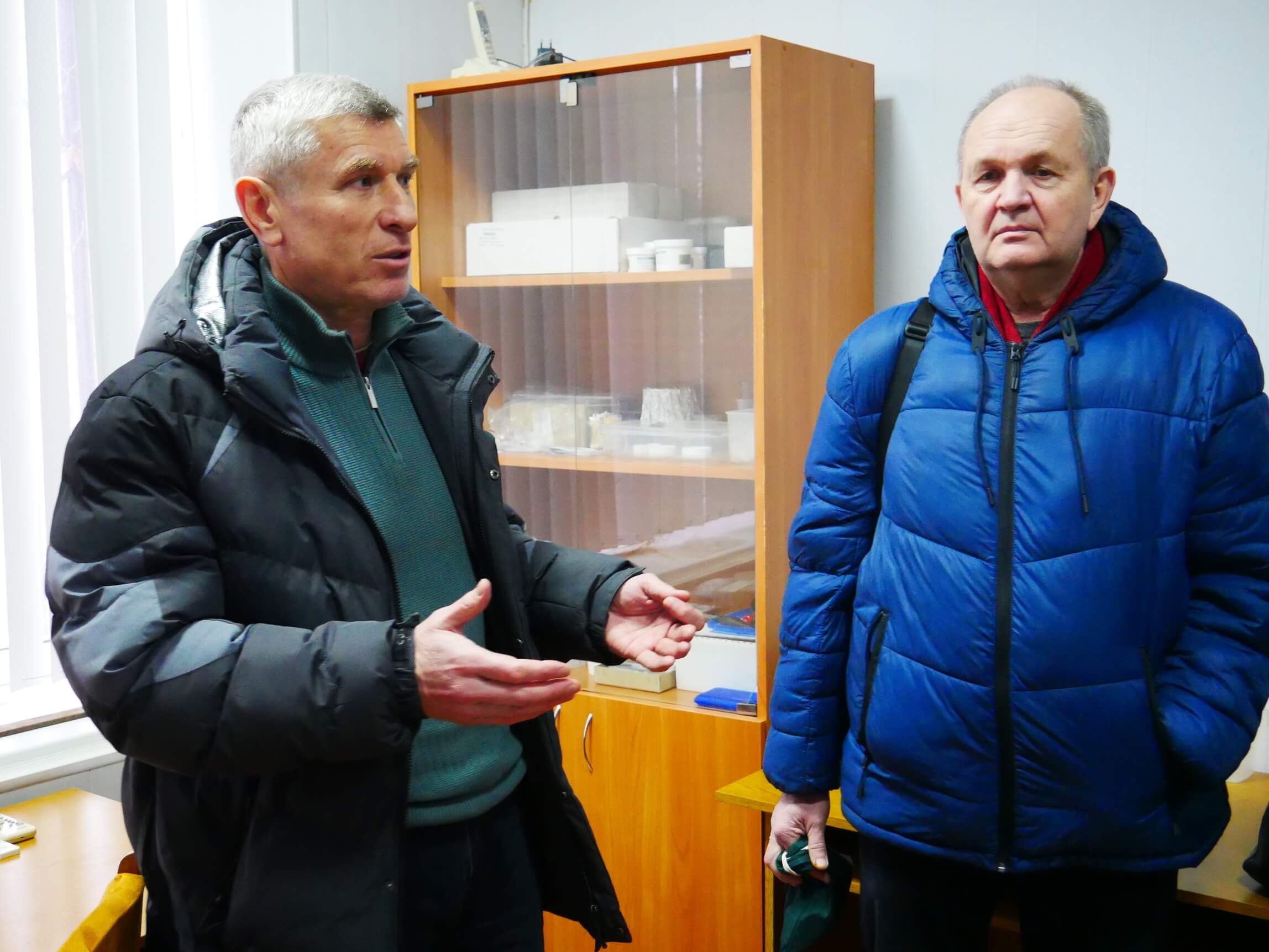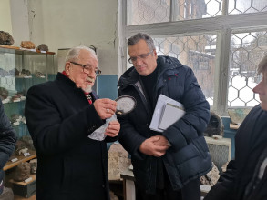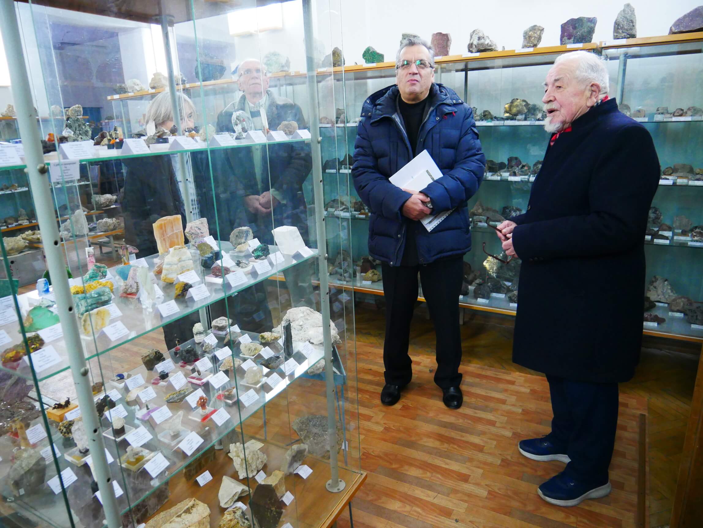 Перший віцепрезидент НАН України академік НАН України Вячеслав Богданов уважно слухає розповідь завідувача відділу «Мінералогічний музей ім. академіка В.І. Вернадського» доктора геолого-мінералогічних наук, професора Володимира Павлишина про мінерали України