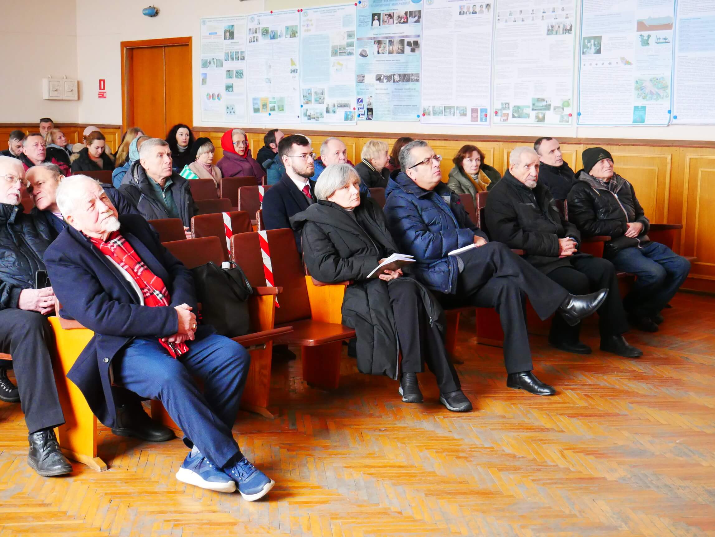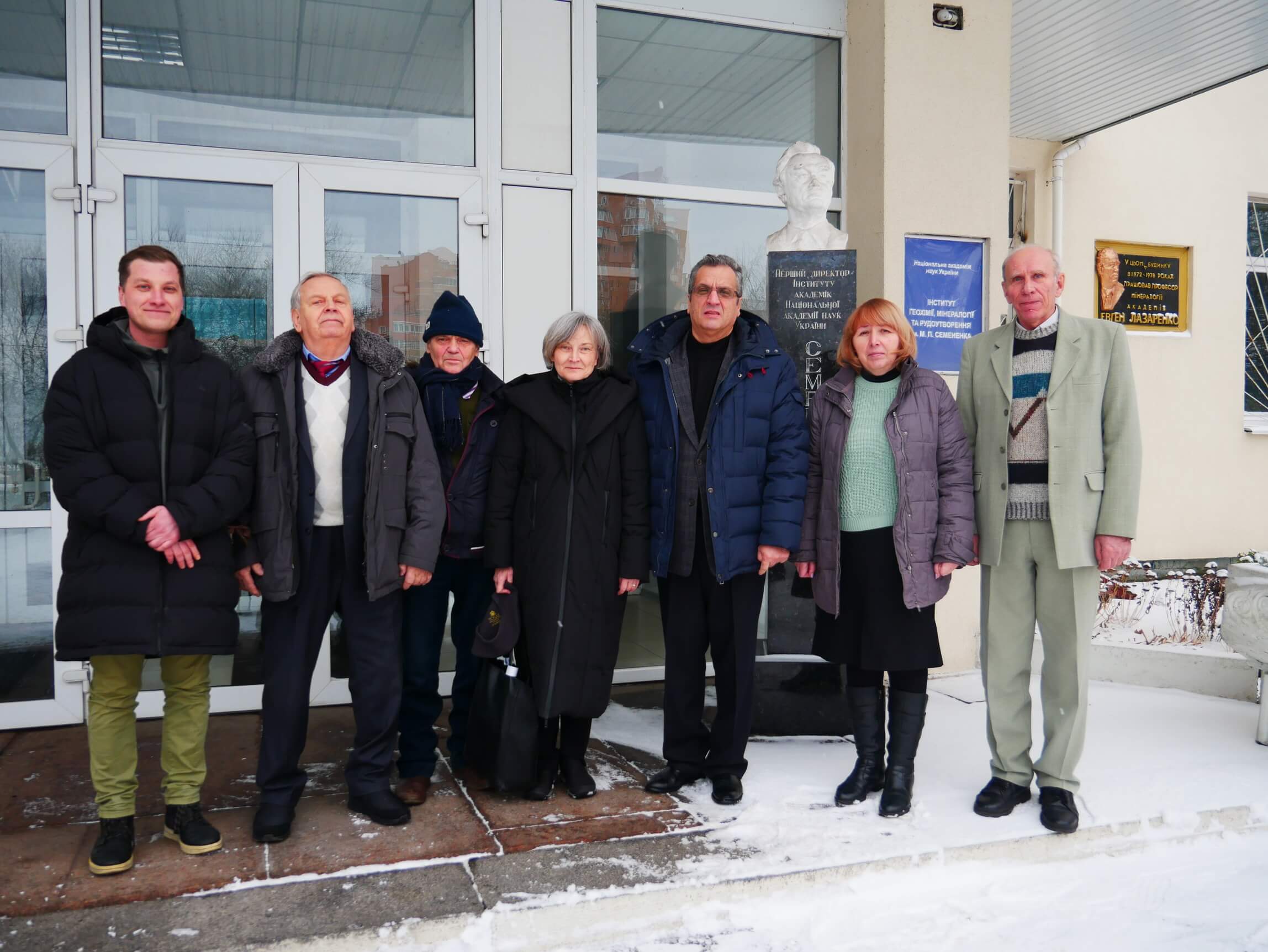 Зліва направо: перший віцепрезидент НАН України академік НАН України Вячеслав Богданов, академік-секретар Відділення наук про Землю НАН України академік НАН України Стелла Шехунова, аспірант Інституту геохімії, мінералогії та рудоутворення імені М.П. Семененка НАН України Богдан Слободян, учений секретар Відділення наук про Землю НАН України кандидат геолого-мінералогічних наук Ярослав Луців, завідувач відділу геології та геодинаміки докембрію Василь Загнітко і заступник директора з наукової роботи Інституту член-кореспондент НАН України Леонід Степанюк