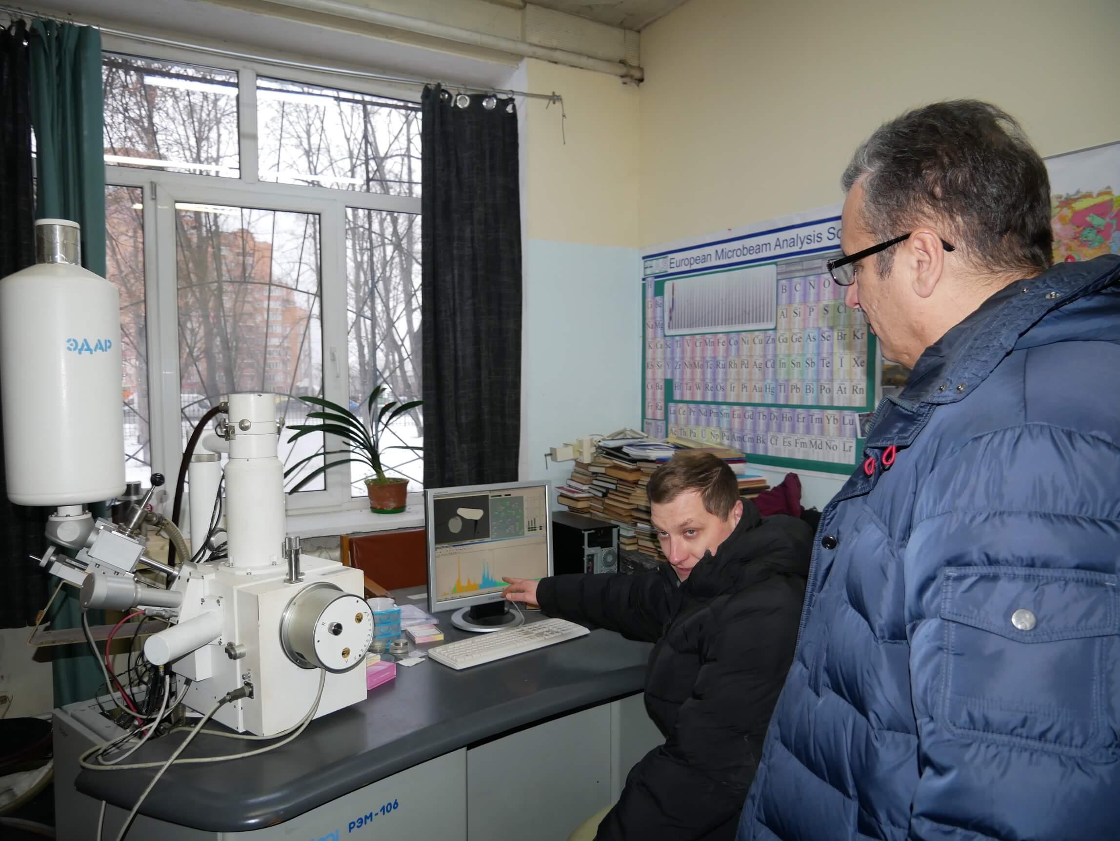 Аспіранти Інституту Борис Мойсеєнко й Олександр Ковтун знайомлять академіка НАН України Вячеслава Богданова з роботою приладів Delta Q та растрового електронного мікроскопа РЕМ-106 И